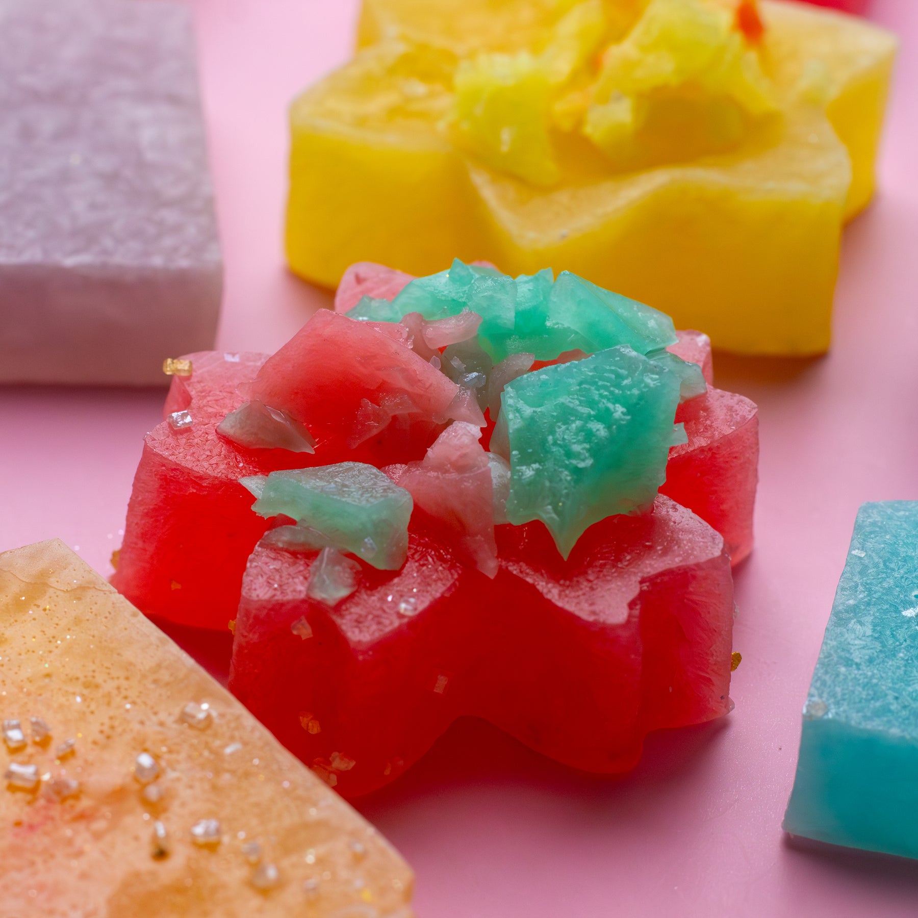 Thành phần: Đường, thạch rêu biển, matcha, dâm bụt, dâu tây, đào, yuzu, anh đào, đậu bướm, xoài, dừa, vải thiều, hoa oải hương, nho, hoa hồng, lê, táo, bạc hà, chanh, tím, lá dứa, dâu đen , việt quất, mâm xôi, sô cô la trắng, gừng, dứa, dưa hấu, táo xanh, táo. quế, nho đen, sô cô la đen, thanh long, nho, chanh dây, vani, nam việt quất, chanh, cam huyết, dầu bơ, vàng cấp thực phẩm, long lanh cấp thực phẩm.